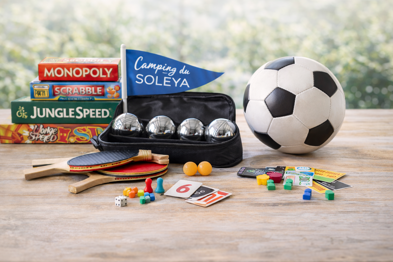 Au Camping du Soleya nous mettons à disposition, gratuitement à l’accueil, différents équipements pour rendre votre séjour plus agréable et divertissant. Côté loisirs, vous pouvez emprunter un ballon de foot, des boules de pétanque, des raquettes de ping-pong, ainsi que divers jeux de société pour des moments conviviaux en famille ou entre amis.
